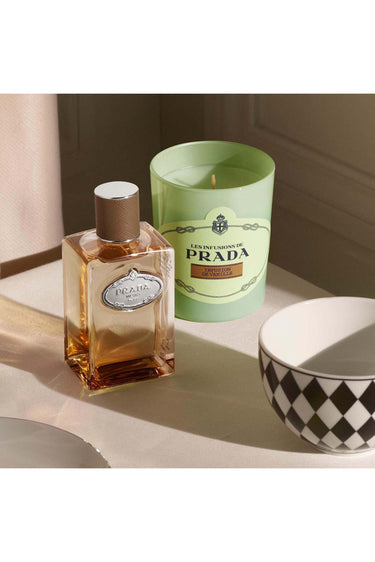 Prada Les Infusion de Vanille Mum, bergamot, dumanlı vanilya ve melekotu tohumlarının büyüleyici birleşimini sunar. Şık opal cam tasarımıyla, 3-4 saat yanma süresi boyunca odanıza şıklık ve sıcaklık katın.