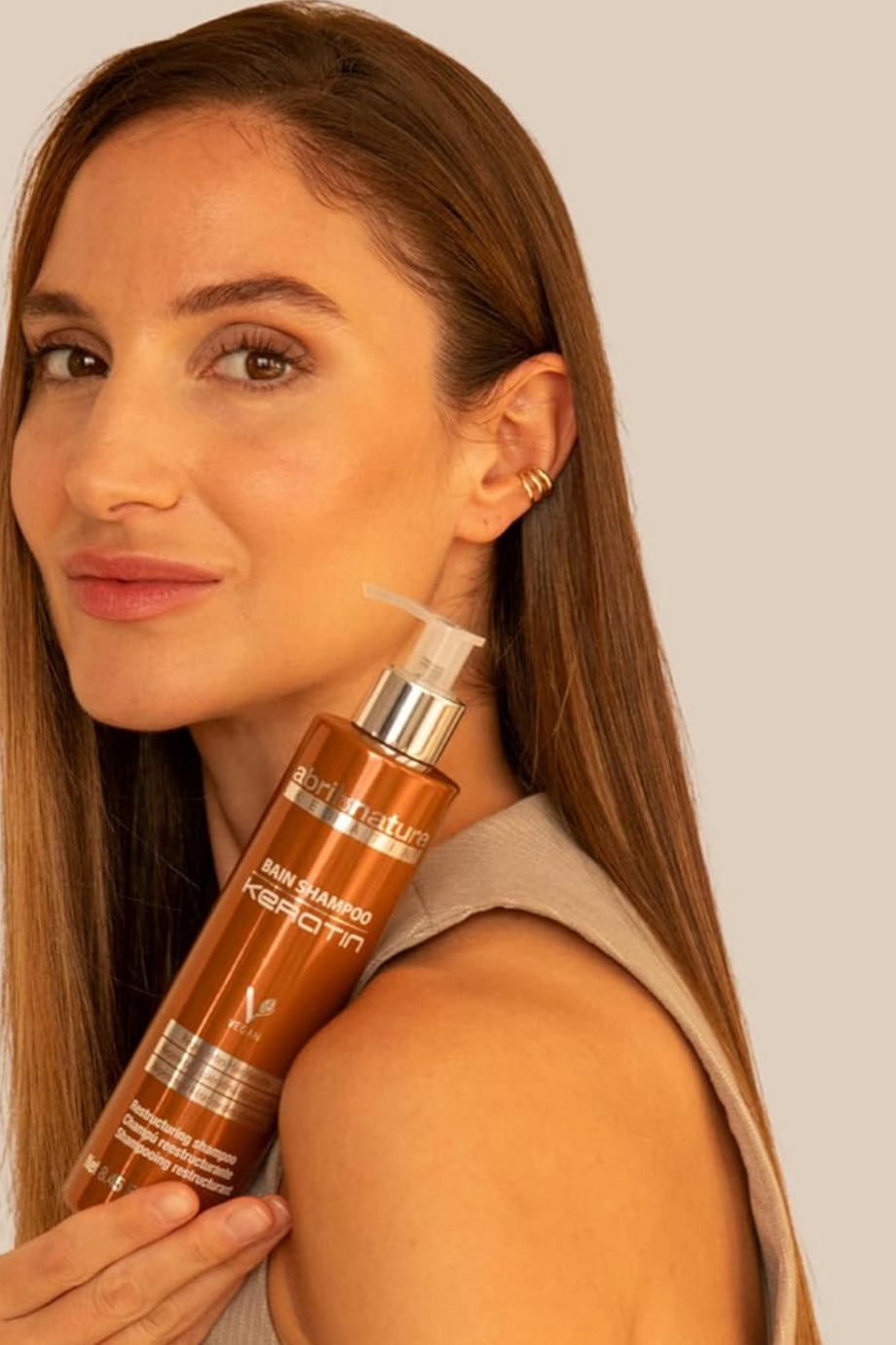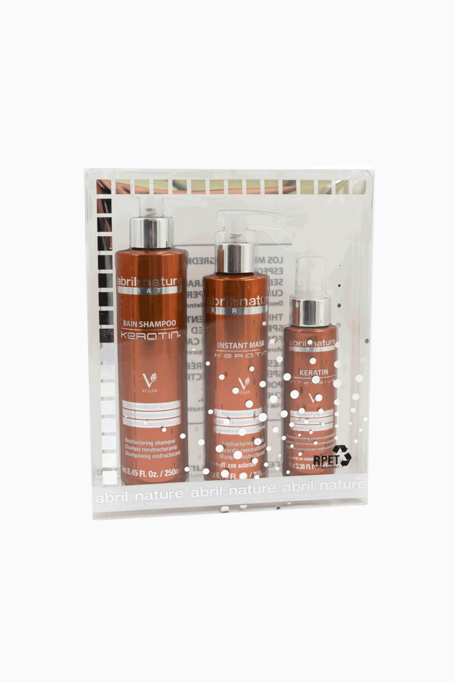 Abril et Nature Professional Keratin Hair Care Set, bitkisel keratin içeriğiyle yıpranmış ve kırılgan saçları onarır, güçlendirir ve nemlendirir. Şampuan, maske ve serumdan oluşan bu profesyonel set saçlara esneklik, parlaklık ve dayanıklılık sağlar.