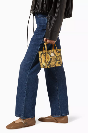 Toni Top-Zip Shopper, yapılandırılmış silueti ve cesur yılan derisi baskısıyla öne çıkıyor. Almanya tasarımı, Güney Kore üretimi ve 24 ayar altın donanımıyla lüks ve fonksiyonel bir tote çanta.