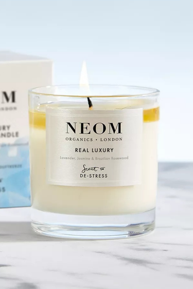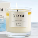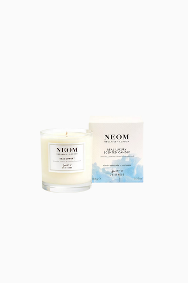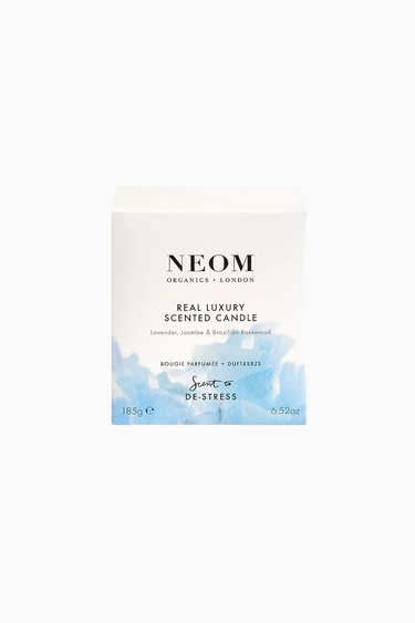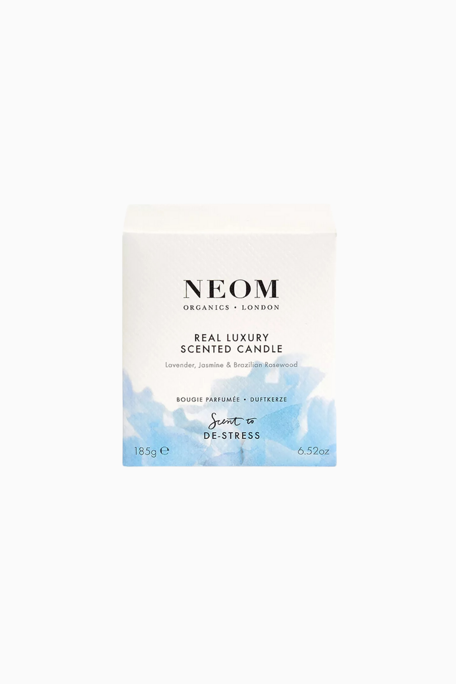 Neom Organics Real Luxury Scented Candle 185g, lavanta, yasemin ve Brezilya gül ağacı özleriyle hazırlanmış %100 doğal mum formülü ile evinize huzur ve lüks katar. 35 saat boyunca yanar ve sakinleştirici bir atmosfer yaratır.