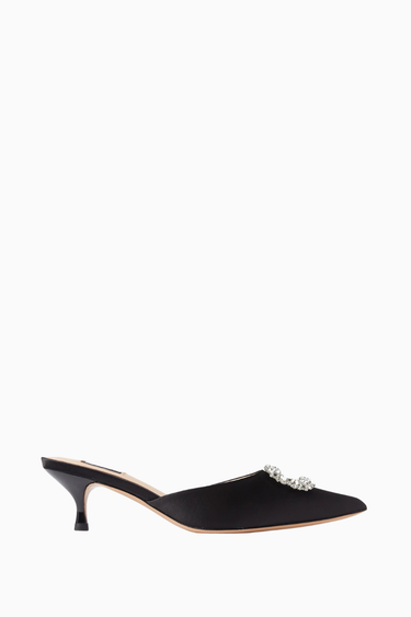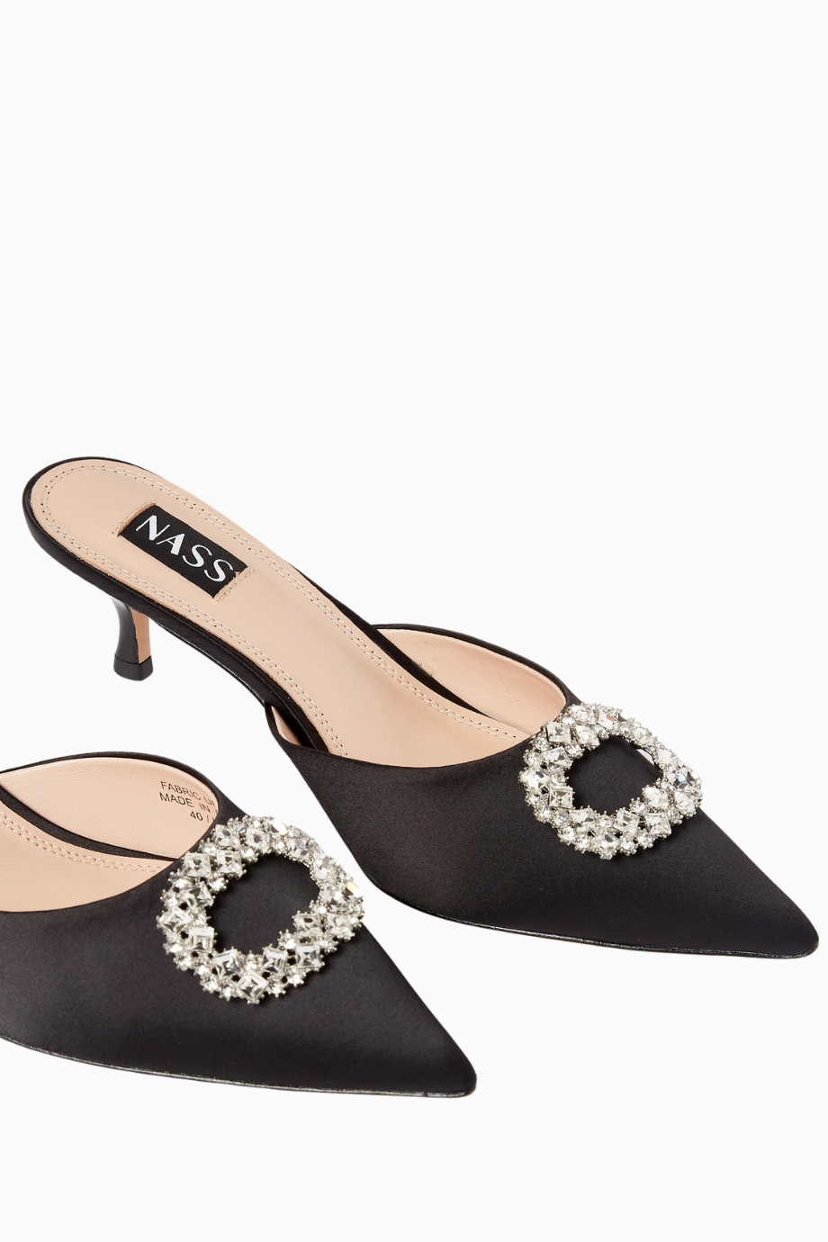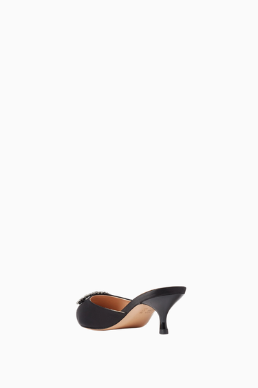 NASS Row 50, siyah saten dokusu ve taş süslemeli sivri burun tasarımıyla zarif ve lüks bir görünüm sunuyor. 50mm topuğu ve deri tabanıyla konforu şıklıkla birleştiren bu mule, gündüzden geceye her stile uyum sağlar.