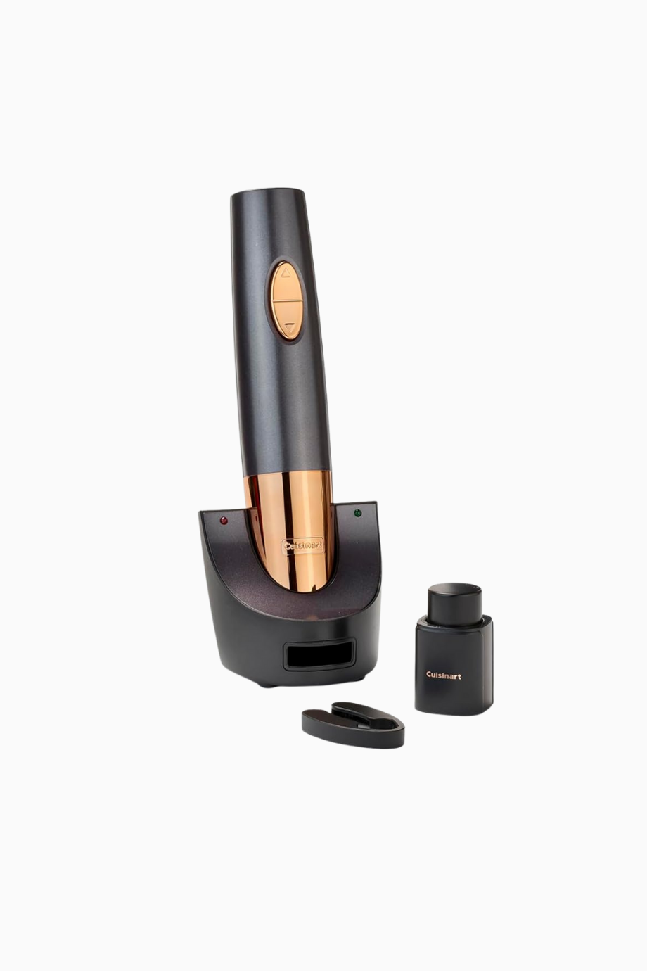 Cuisinart şarj edilebilir otomatik şarap açacağı, tek dokunuşla 80 şişeye kadar kolay mantar çıkarma özelliği sunar. Entegre vakum mühürleyici ve tarih göstergesiyle şarabın tazeliğini korur. Şık siyah tasarımı, folyo kesici ve şarj istasyonuyla birlikte gelir; şarap severler için zarif bir hediye seçeneğidir.
