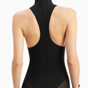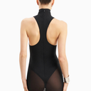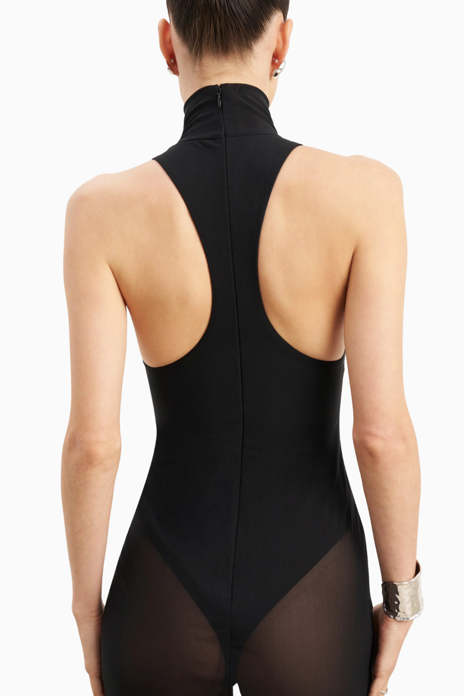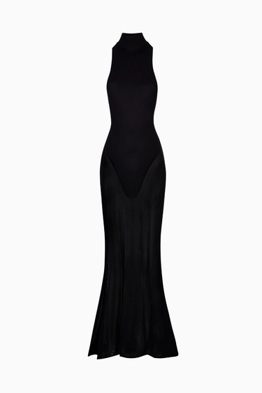 Sheer High Neck Racerback Gown, cesur ve sofistike bir siluet sunan yarı şeffaf yapısıyla dikkat çeker. Entegre vücut şekillendirici bodysuit, yüksek yaka ve racerback sırt detayıyla modern bir zarafet yaratır. Esnek file kumaşıyla vücuda oturan, akıcı maxi tasarım.