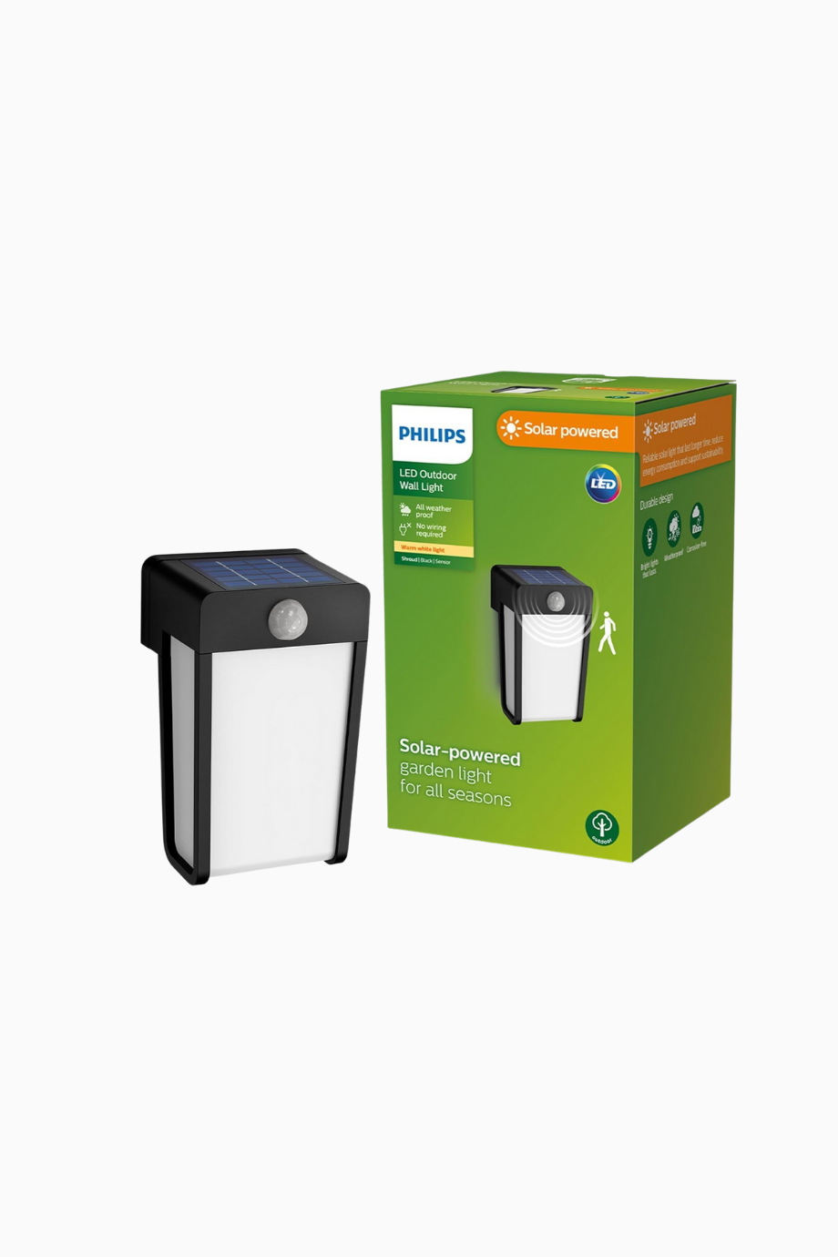 Philips Outdoor Solar Shroud duvar lambası, 2.3W gücü, 2700K sıcak beyaz ışığı ve hareket sensörü ile dış mekanlarınızı enerji tasarruflu şekilde aydınlatır. IP44 koruması sayesinde hava koşullarına dayanıklı yapısıyla bahçe, teras ve giriş alanları için idealdir.