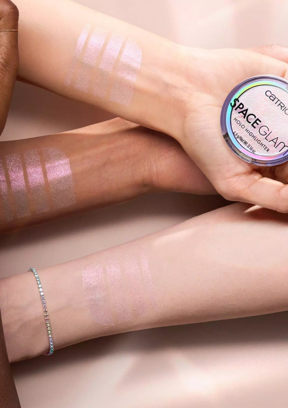 Catrice Space Glam Holografik Aydınlatıcı 010, pembe, altın ve limon tonlarında ışıltılı bir görünüm sunar. Ultra hafif, yapılandırılabilir toz formülü sayesinde yanaklara ve gözlere çok boyutlu, büyüleyici bir holo etki kazandırır. Vegan ve paraben içermez.