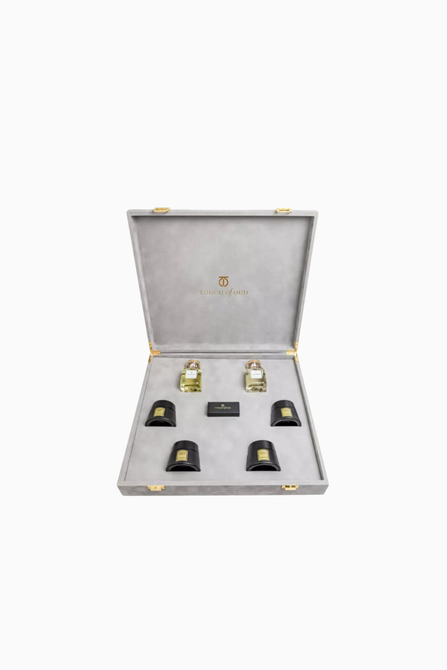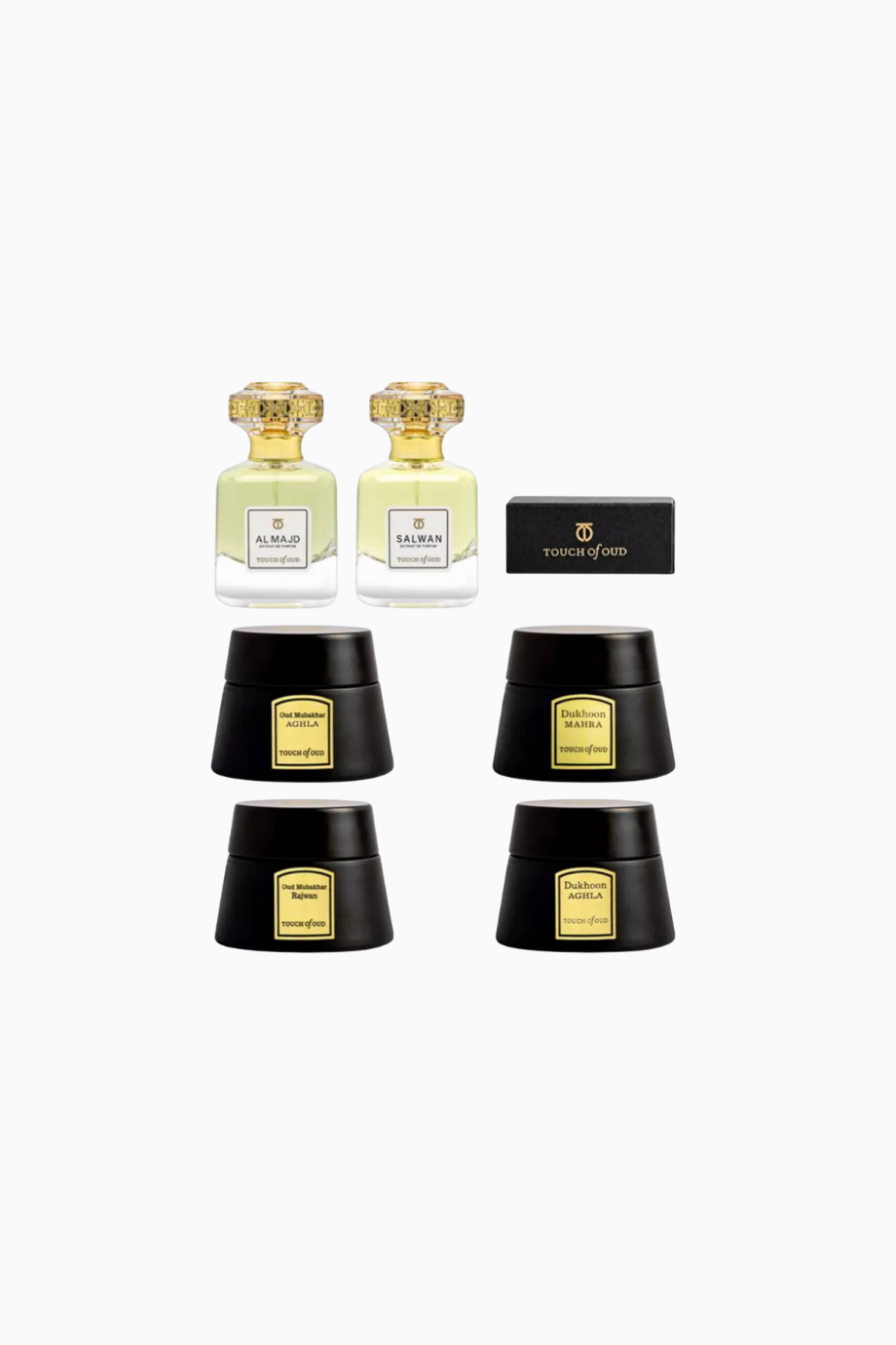 Touch Of Oud The Essence Collection, yedi parçadan oluşan özel bir lüks hediye setidir. Al Majd ve Salwan parfümleri ile dokhoon ve oud mubakhar çeşitleri, evinize zamansız bir koku deneyimi sunar. Şık kutusu ile özel hediye seçeneği sunar.